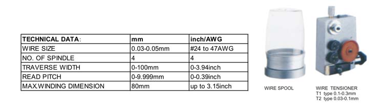| ? | The BW4 is an up-to date multi-spindle controlled bench top model of high quality and considerable value.It is designed for power coils, it is for spindles,multifunctional controller and stable winding pitch system. It uses a special inverter motor and driver as its main winding power, and a precise stepping motor to adjust wire pitch in order to meet the extra requirement of customer’s high-quality control. And it has proven to be the optimal choice in VC’s BOBBIN winding machines for fine wire applications with 4-spindles.